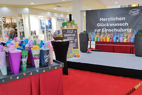 Der Besucher / ABC-Schütze erhält eine „leere“, gebrandete Schultüte und geht damit im Center von Mieter zu Mieter, um sich diese befüllen zu lassen. Dazu bieten wir ergänzende Bastelangebote wie Schultüten für Geschwisterkinderbasteln oder ABC-Malstraße sowie eine Fotostation als Erinnerung zum Sofortdruck oder Versenden an Freunde.
